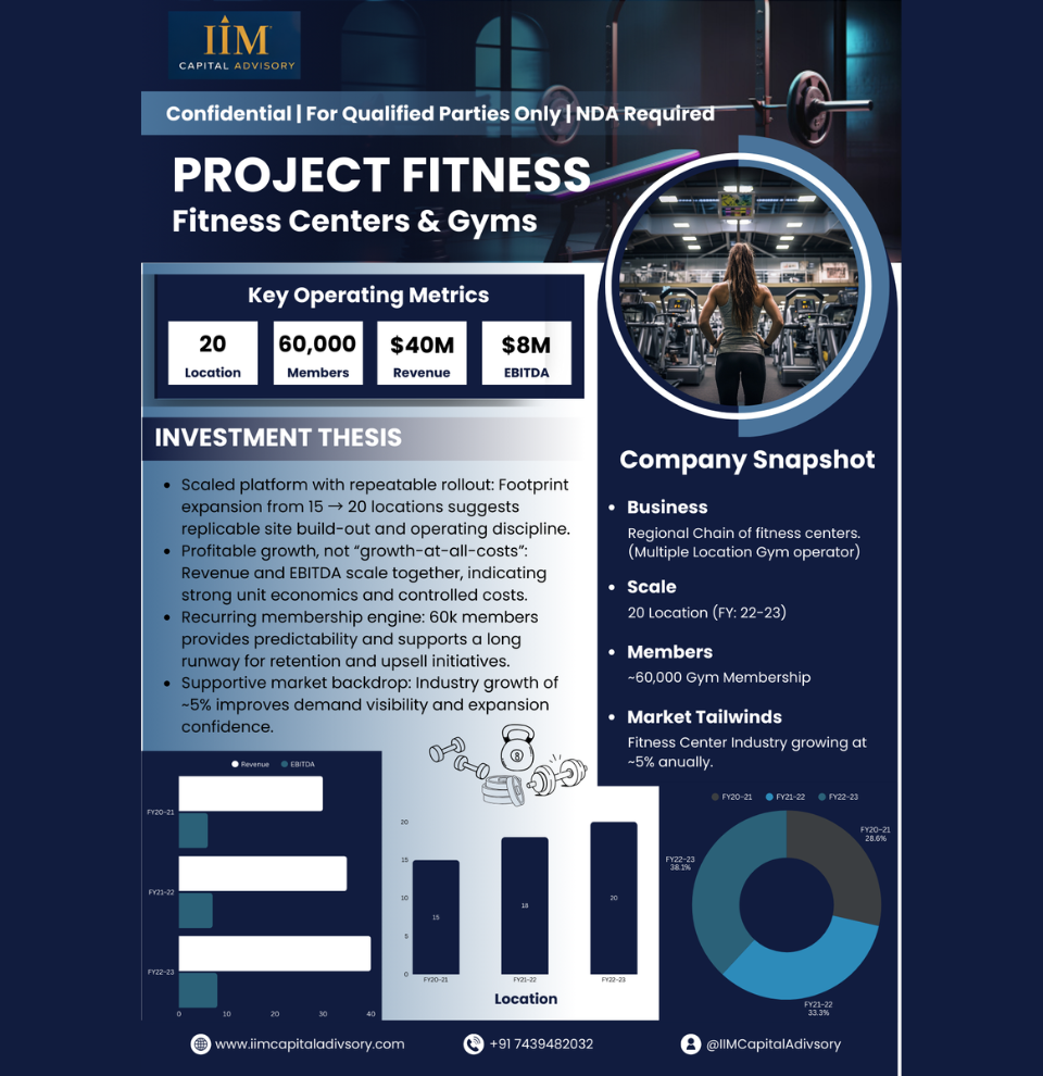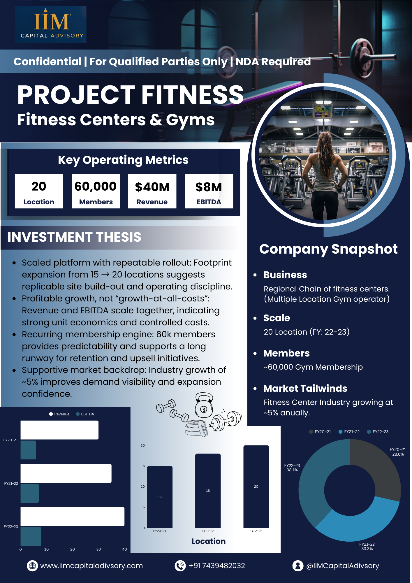 • Built full buy-side marketing materials (Teaser + CIM) for a simulated PE acquisition of a regional fitness chain, covering business overview, market dynamics, financial performance, and investment thesis → Developed executive summary, company positioning, industry analysis, growth drivers, and transaction rationale (Project Fitness) • Analyzed historical revenue, EBITDA, margins, unit expansion, and valuation benchmarks to support acquisition attractiveness using EV/EBITDA multiples from industry comps • Built a 5-year integrated financial model (Income Statement, Balance Sheet, Cash Flow) for a consumer retail expansion case (coffee chain new store rollout) including: – Revenue forecasting & cost structure build-up – Capex & working capital linkage – Break-even & sensitivity analysis on key assumptions • Translated operating assumptions into investor-ready financial projections, profitability analysis, and capital structure impacts • Produced decision-focused outputs highlighting growth feasibility, return drivers, and risk sensitivities for expansion investment